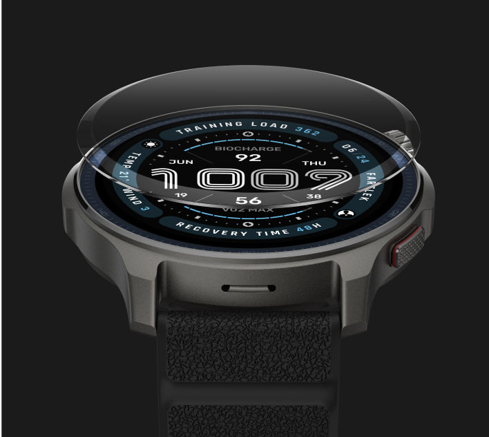 Health tracking is provided by the BioTracker 6.0 PPG biometric sensor, monitoring heart rate, SpO₂, stress, and sleep (including REM, naps, and breathing quality). It also measures HRV, body composition, and BioCharge™ score. Other sensors include accelerometer, gyroscope, barometer, ambient light, geomagnetic sensor, and thermometer. The watch features dual-band GPS supporting six satellite systems.