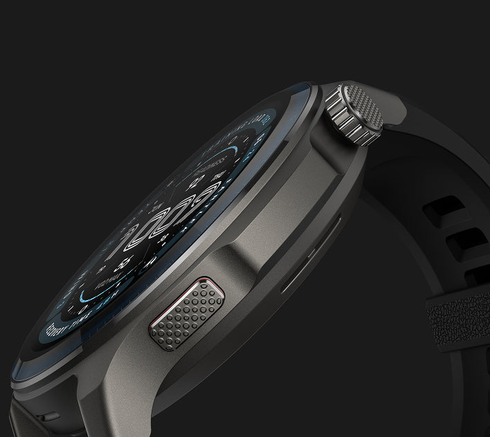 - Buttons: Two physical buttons, with the top one acting as a digital crown.