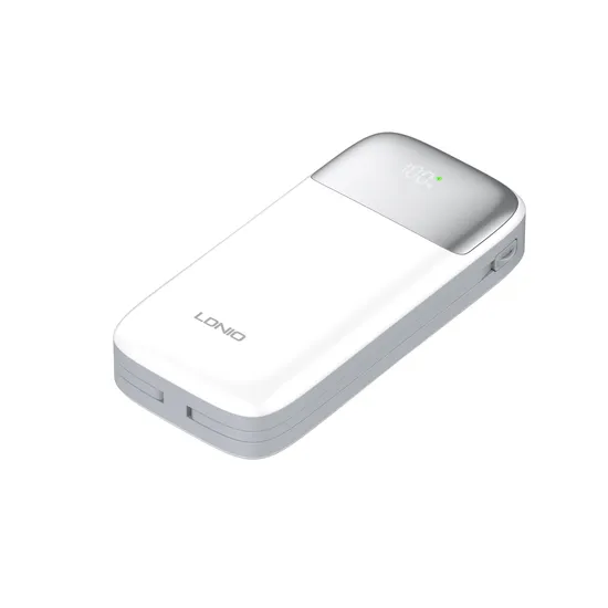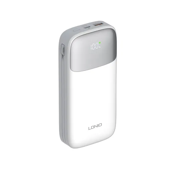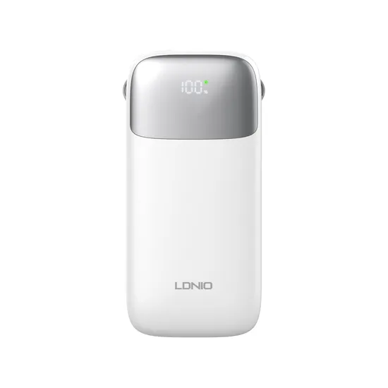 The LDNIO PQ20 20000mAh Power Bank is a fast-charging, high-capacity portable charger that comes with built-in cables for convenience. It features a maximum total output of 22.5W and includes an LED display to show the remaining battery life.