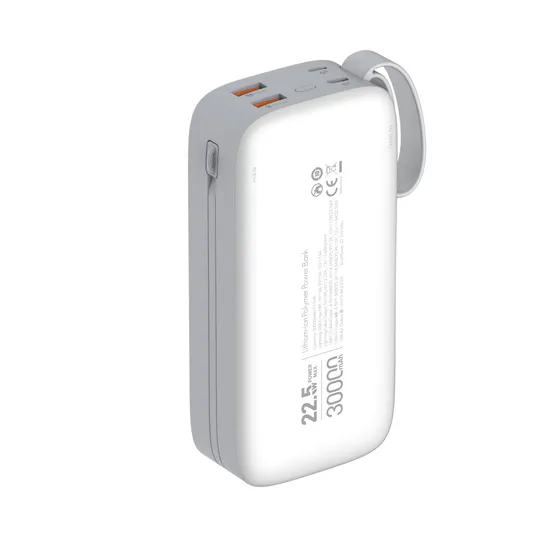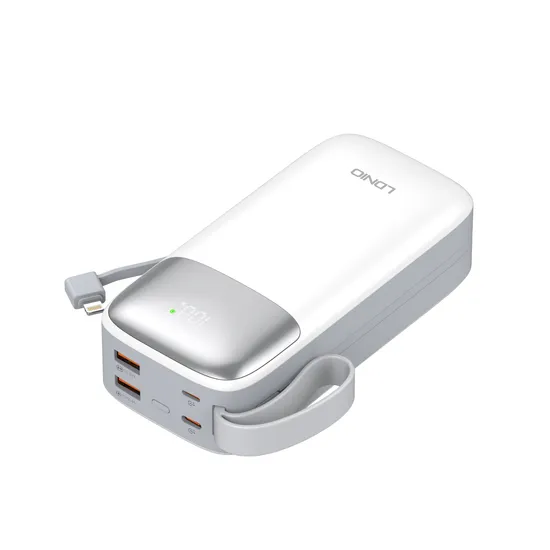 The LDNIO PQ30 30000mAh Power Bank is a high-capacity portable charger that features built-in USB-C and Lightning cables for convenience. It offers fast charging capabilities with a maximum output of 22.5W and includes an LED display to show the remaining battery level.