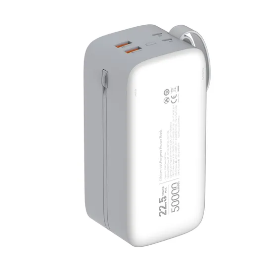 The LDNIO PQ50 50000mAh Power Bank features a large capacity, multiple charging ports with fast-charging capabilities, and built-in USB-C and Lightning cables for convenience.